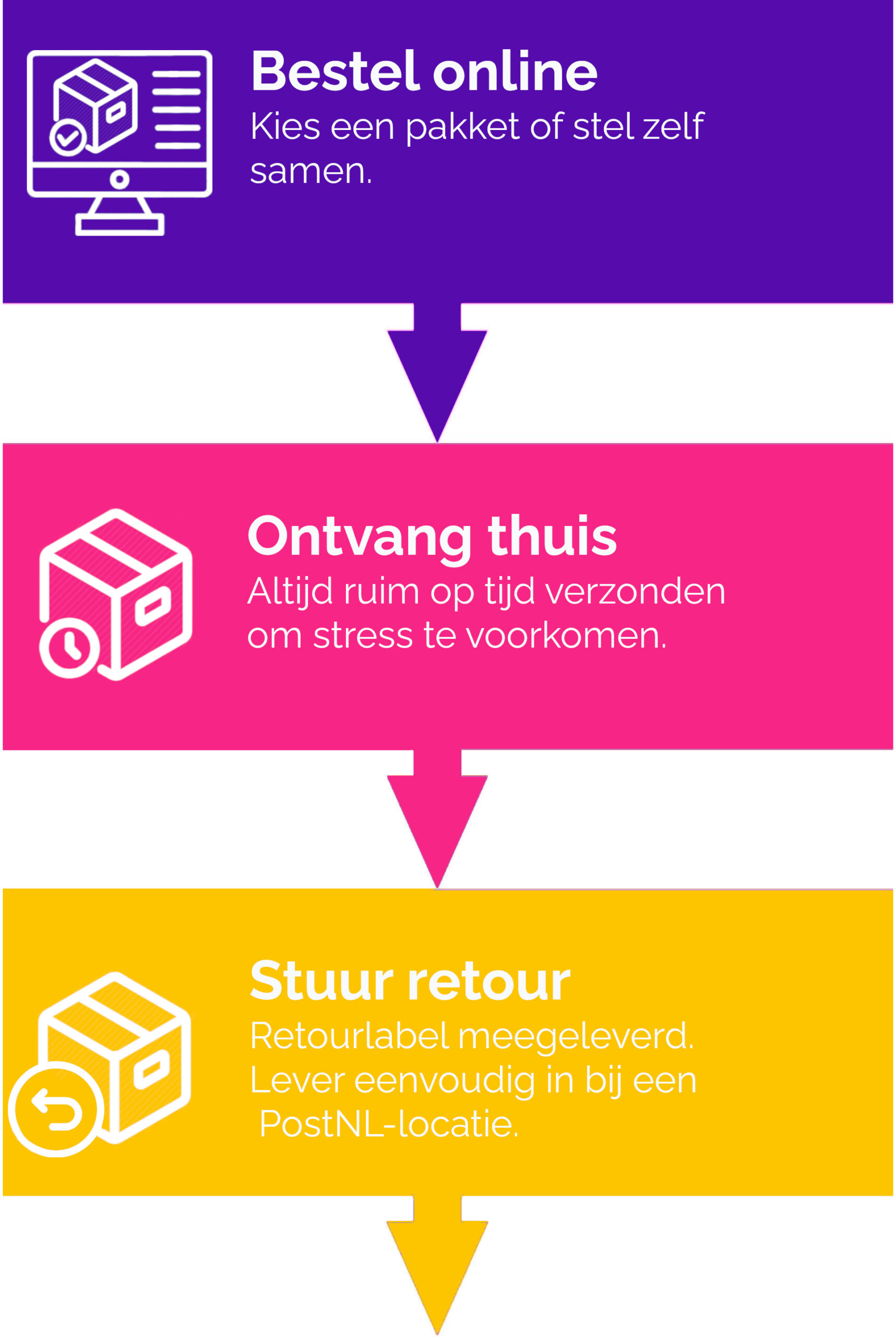 Bij de set leveren we een gebruiksaanwijzing, verzegeling en een verzendlabel om het pakket terug te sturen. De eerstvolgende werkdag na het feest mag het pakket ingeleverd worden bij een PostNL-servicepunt. Je hoeft hier niets te betalen.